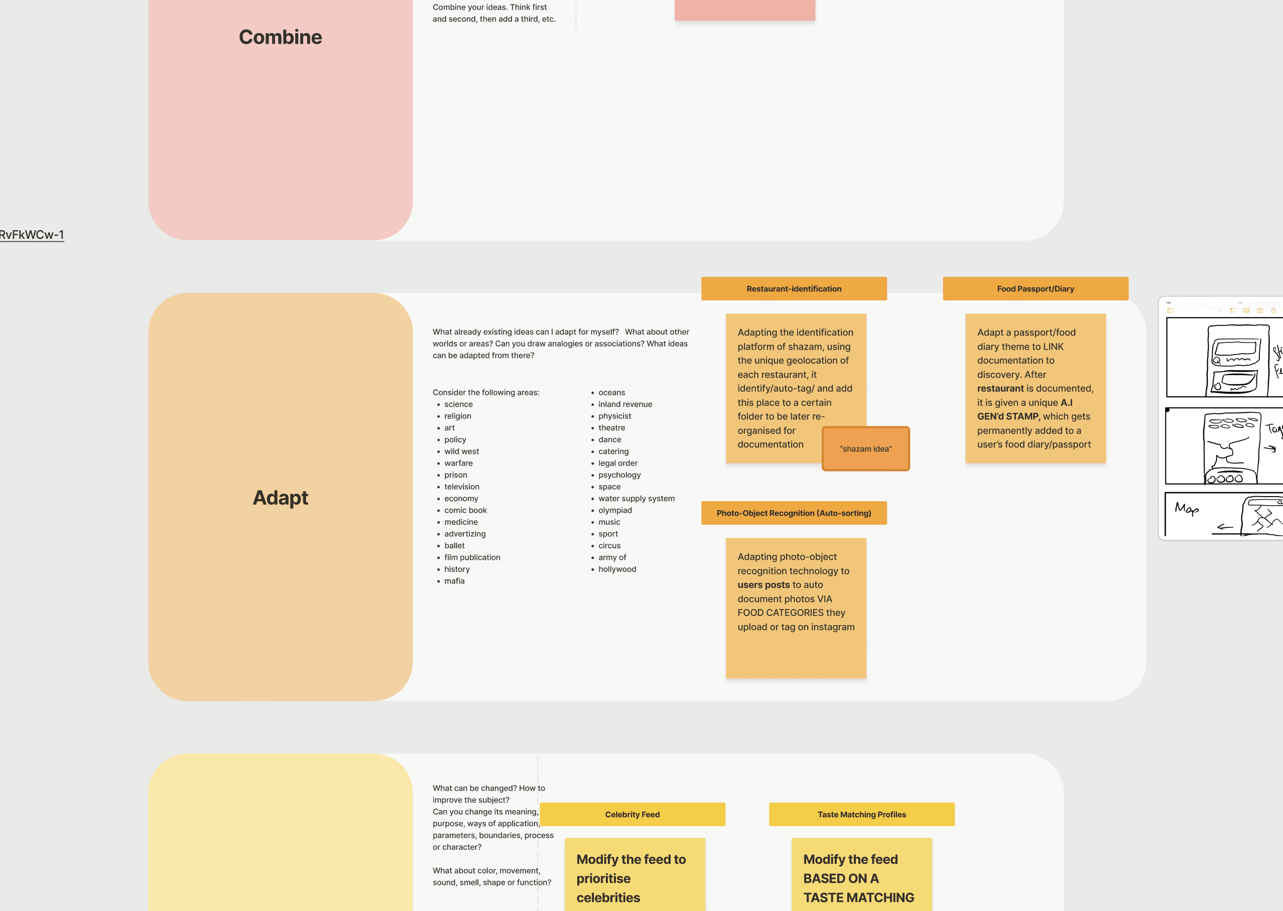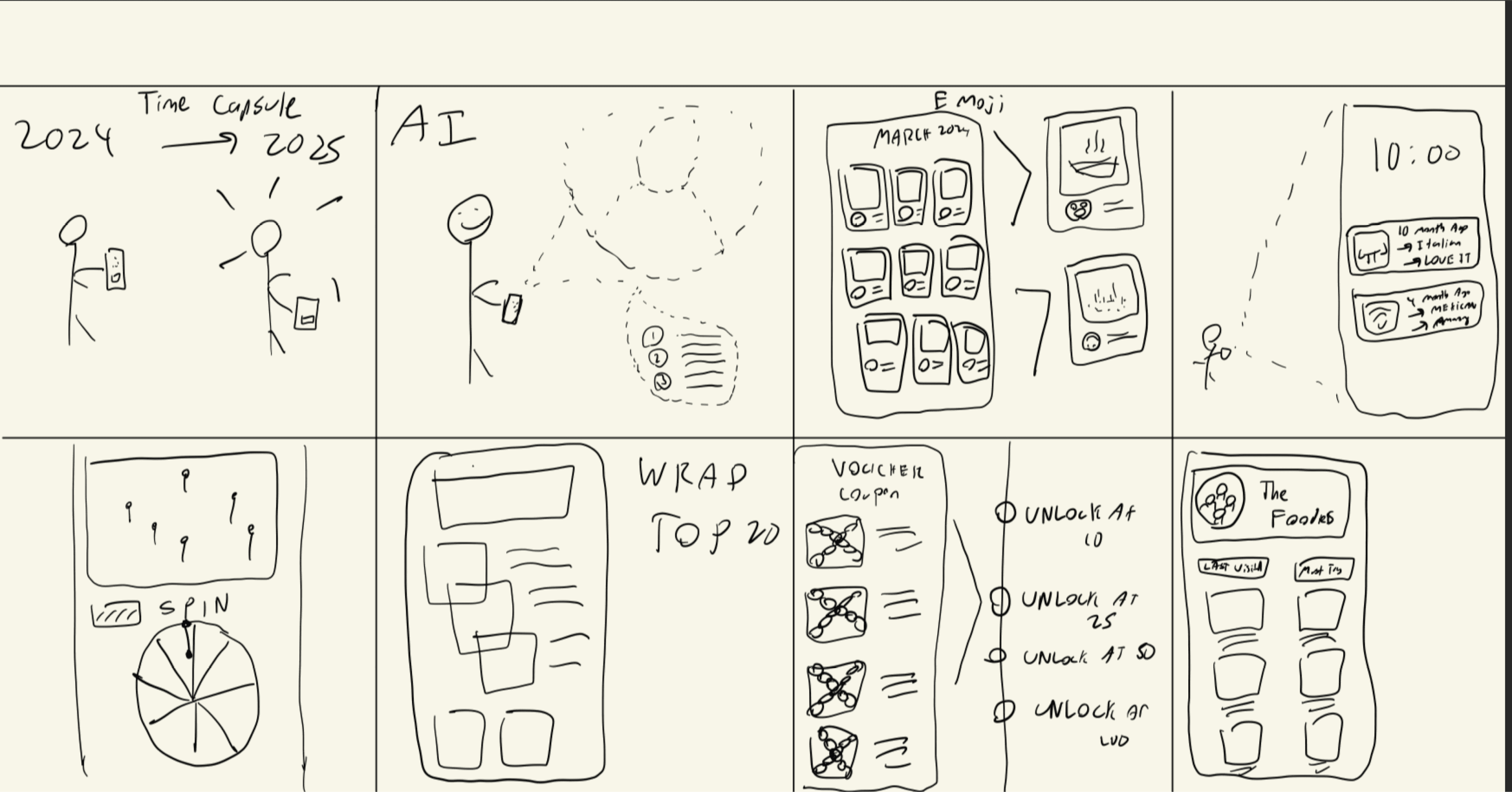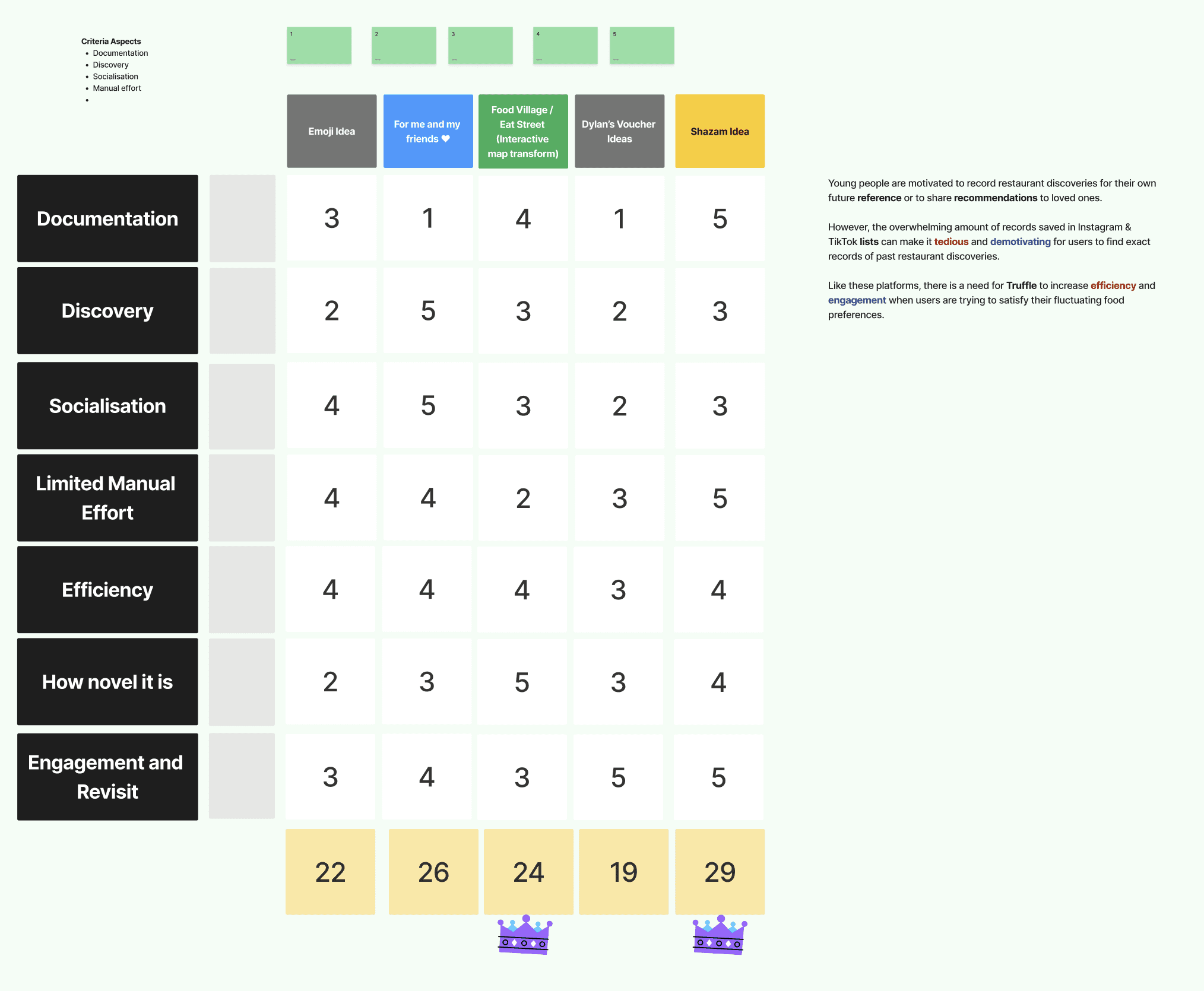 We used Crazy 8s and SCAMPER to rapidly generate concepts grounded in our insights, focusing on visual-first browsing, dietary-trust filters, time and location-based recall, and opinion-sharing. To narrow down, we ran a decision matrix similar to MoSCoW to prioritise the directions that best aligned with the problem.
