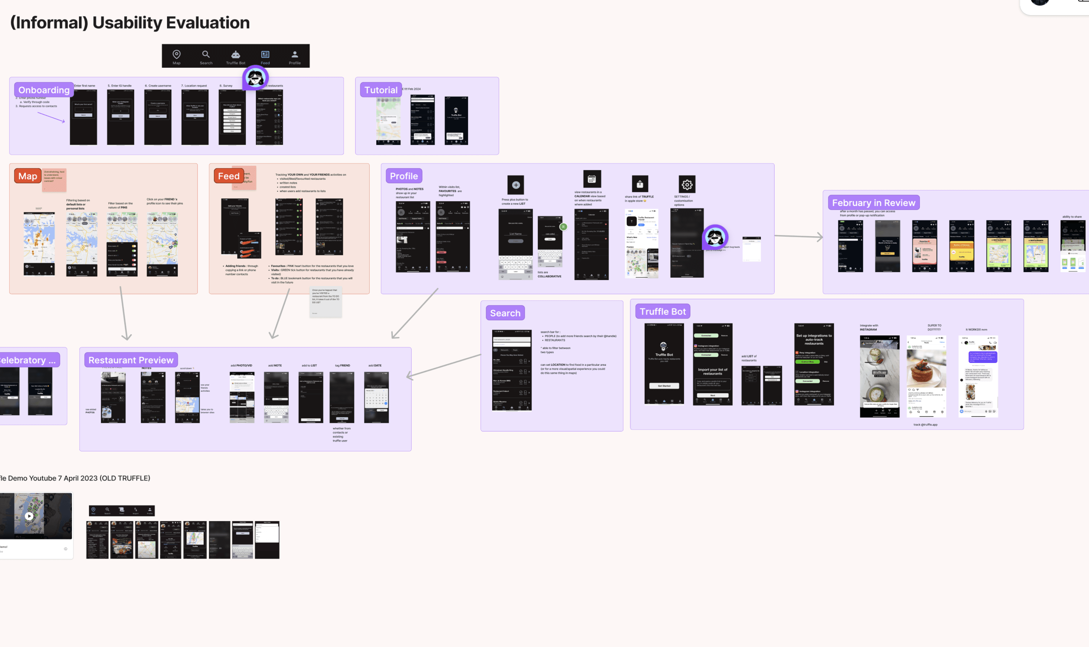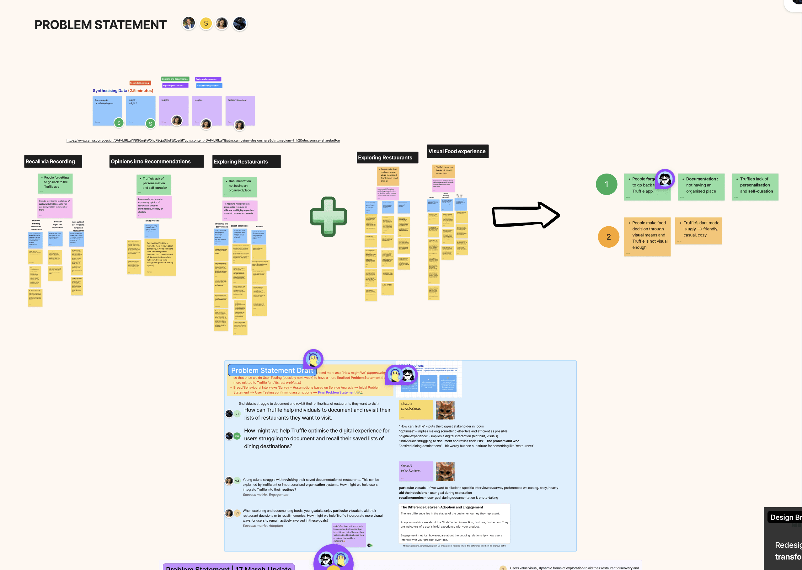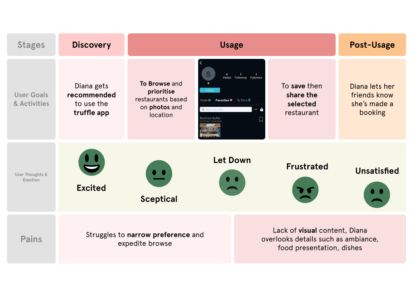 We began in the empathy phase by unpacking the brief and forming research questions around behaviours, motivations, and the intersection of food and social media. From there, we immersed ourselves in Truffle through usability evaluation, desktop research, and competitor analysis to understand its target users—variety-seeking individuals driven by exploration and self-expression