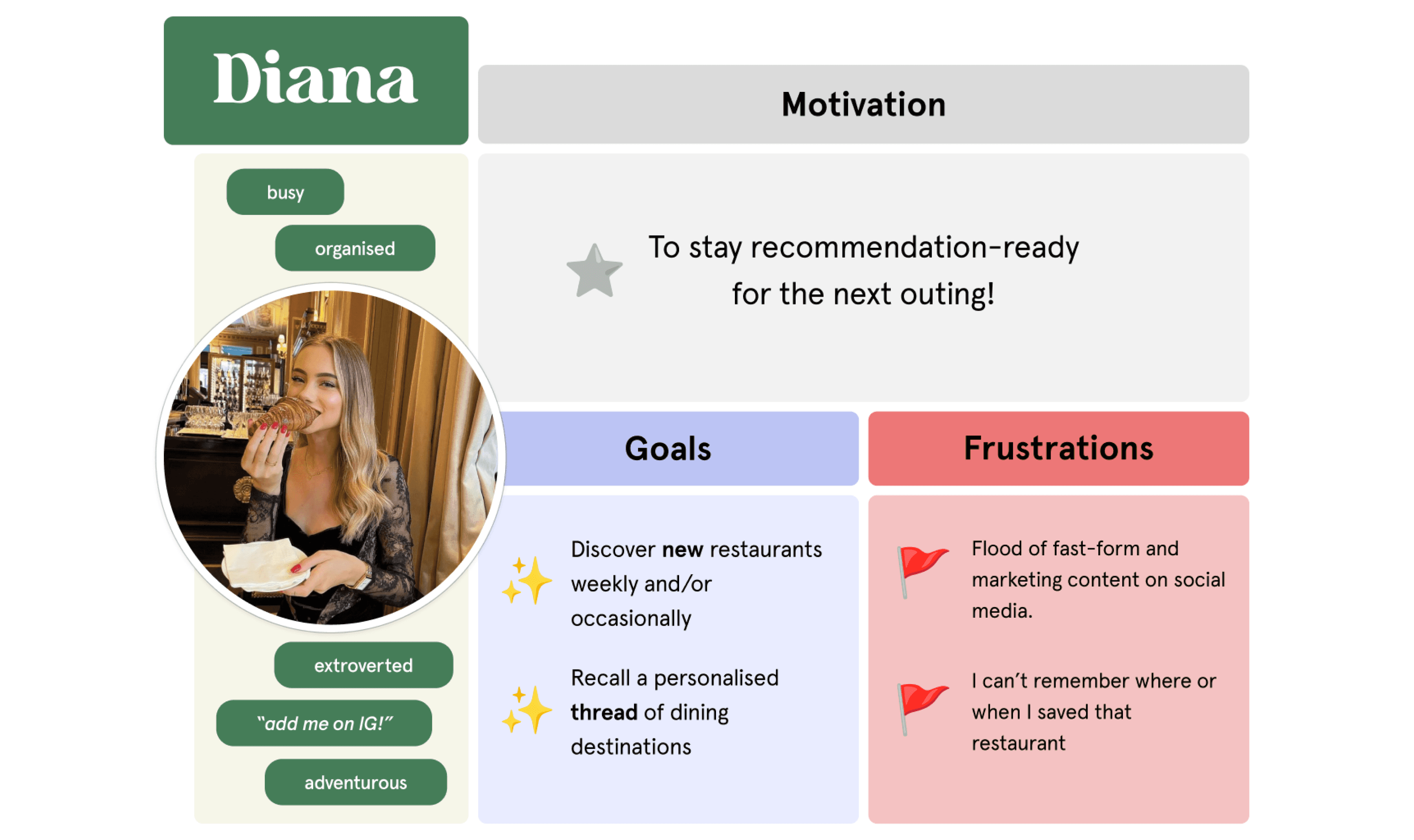 We translated our insights into personas to ground the problem in real behaviours. Diana represents a variety-seeker, someone constantly discovering new places, but struggling to keep track of them in a way that’s actually useful later. Through stakeholder workshops, we mapped and prioritised the core user goals that shape this experience, aligning them with what the product needs to deliver.