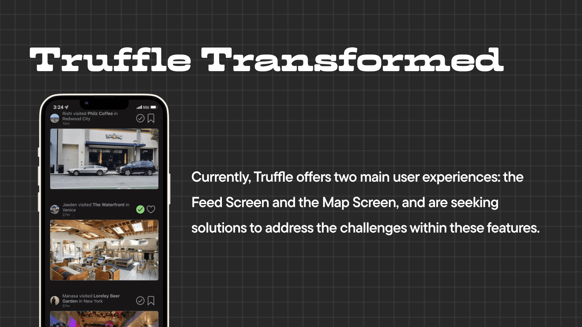 Working across research and design, I helped reshape Truffle’s core experience and introducing a clearer structure with features that actually support how people discover and remember places.