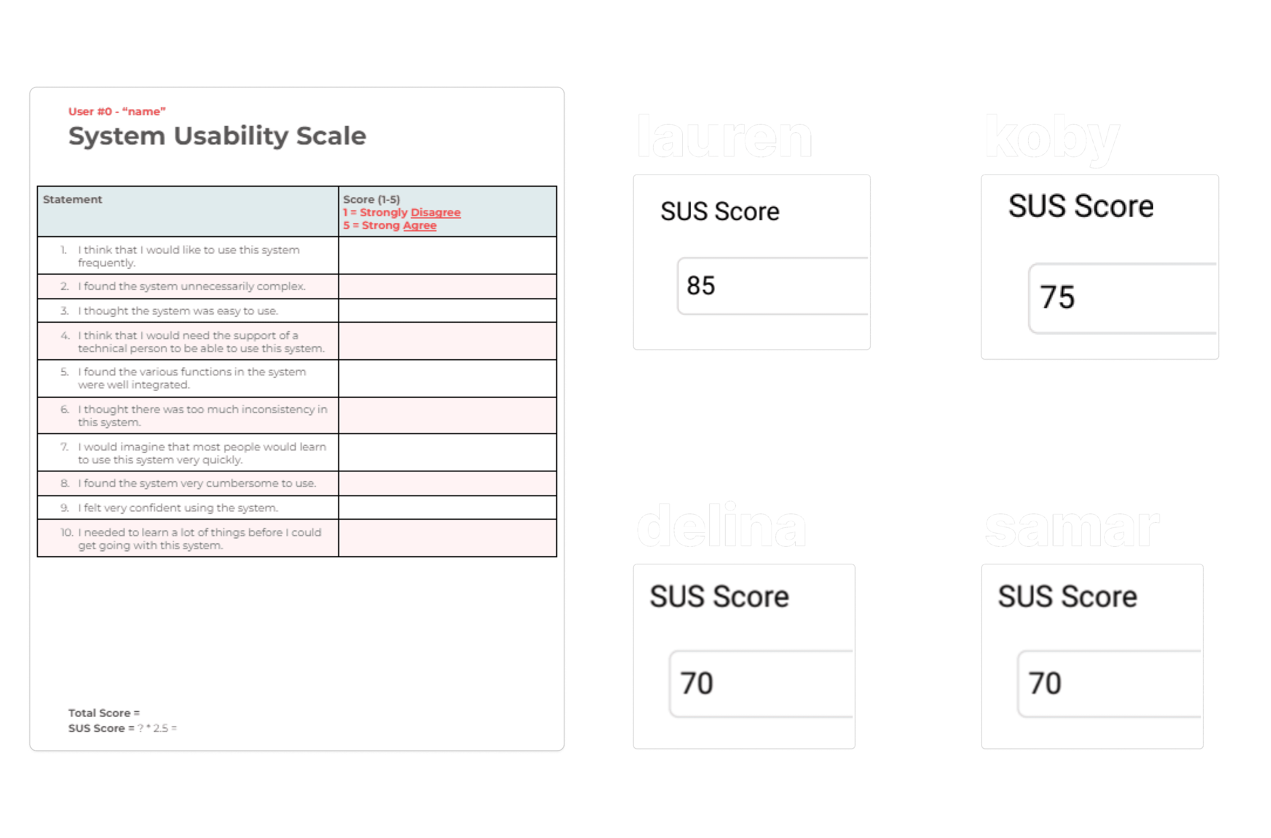 After testing, we used the System Usability Scale (SUS) to measure how intuitive and usable our designs were across participants. Scores ranged from 70 to 85, indicating a generally strong level of usability while highlighting areas that still required refinement.